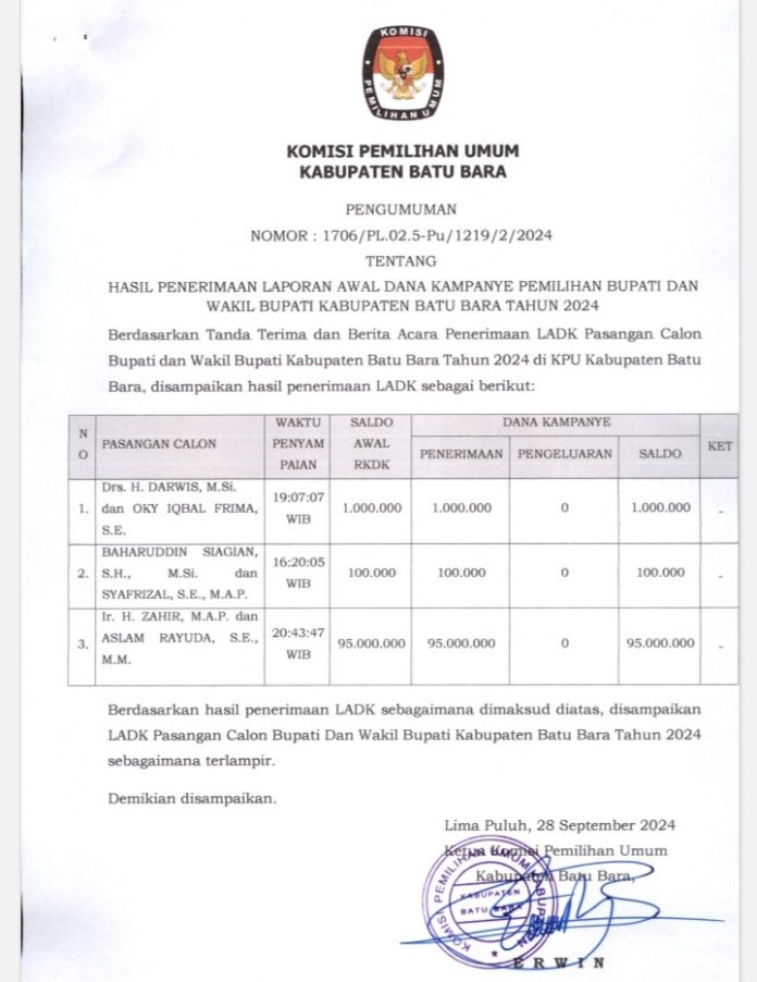 Batu Bara – BataraTV.com | Berdasarkan pengumuman Laporan Awal Dana Kampanye (LADK) Pemilihan Bupati dan Wakil Bupati Kabupaten Batu Bara, Sumut Tahun 2024 ternyata Paslon nomor 3 Zahir – Aslam Rayuda memiliki dana terbesar diikuti Paslon nomor 1 Darwis-Oky Iqbal Frima dan paling rendah Paslon nomor 2 Baharuddin Siagian-Syafrizal.