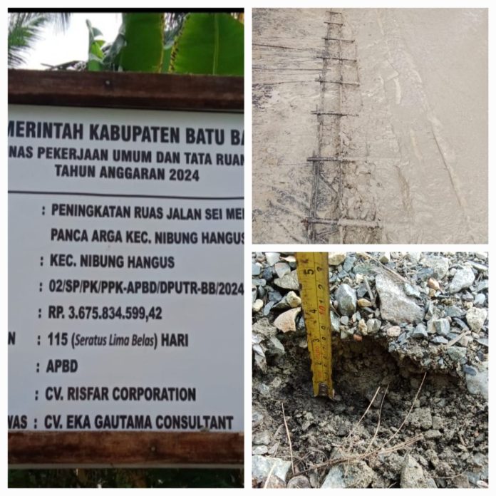 Pekerjaan tersebut di nilai kurang baik, dan mengurangi volume anggaran dengan No kontrak:02/sp/pk/ppk-APBD/DPUTR-BB/2024.dan nilai kontrak :Rp.3.675.834.599, 42. serta masa pelaksanaan pekerjaan 115(seratus lima belas) hari yang bersumber dana APBD yang dimenangkan oleh pihak CV. Risfar Corporation dan konsultan Pengawas: CV.Eka Gautama Consultant.