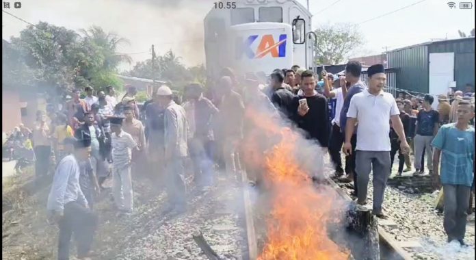 Ratusan warga memblokir lintasan kereta api (KA) di Desa Lalang Kecamatan Medang Deras Kabupaten Batu Bara dengan membakar ban mobil ditetangah-tengah rel, Jumat (28/2/25).