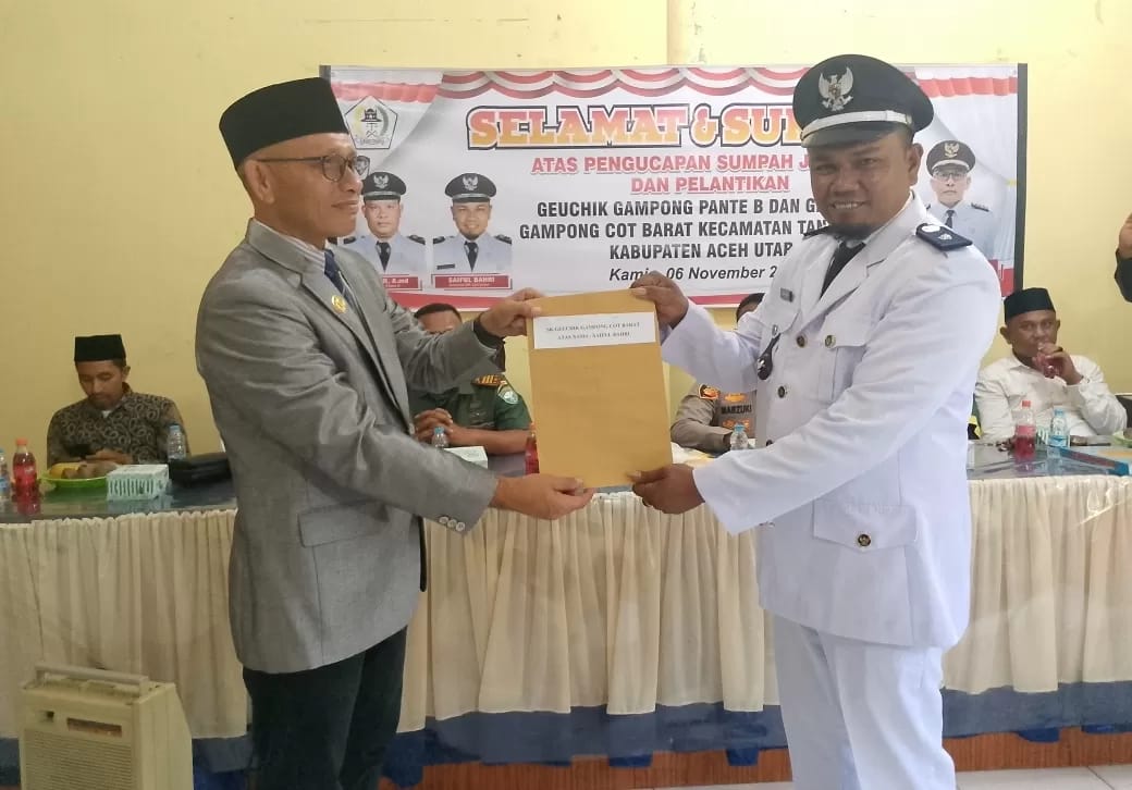 Pelantikan tersebut dilakukan langsung oleh Camat Tanah Luas Bakhtiar, SE yang dalam sambutannya menyampaikan selamat kepada Saiful Bahri atas kepercayaan masyarakat Gampoeng Cot Barat yang telah memilihnya untuk memimpin Gampong Cot Barat enam tahun ke depan.“Kami berharap Geuchik yang baru dapat menjalankan amanah dan pesan dengan penuh tanggung jawab, transparan dalam pengelolaan dana desa, serta mampu bekerja sama dengan perangkat gampong dan masyarakat dalam membangun Cot Barat ke arah yang lebih baik,” ujar Bakhtiar dalam sambutannya. Beliau juga menekankan pentingnya kolaborasi antara pemerintah gampong dengan berbagai pihak, terutama dalam meningkatkan pelayanan publik, kesejahteraan masyarakat Gampoeng Cot Barat, dan memperkuat nilai-nilai gotong royong di tingkat desa.