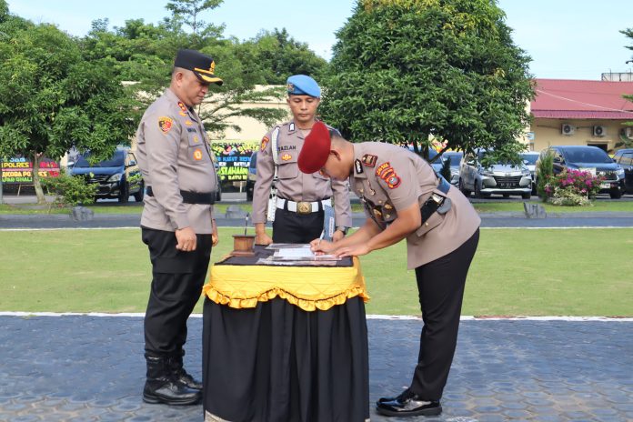 Kapolres Batu Bara AKBP Doly Nelson HH Nainggolan memimpin serahterima (Sertijab) 4 pejabat utama (PJU) Polres Batu Bara di halaman Apel Polres Batu Bara di Lima Puluh, Senin (21/4/2025).