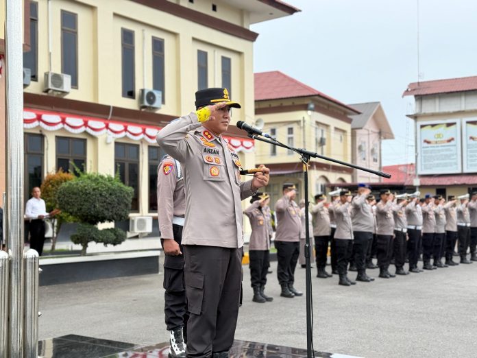 Kapolres Lhokseumawe AKBP Dr. Ahzan, S.H., S.I.K., M.S.M., M.H memimpin apel pagi di halaman Mapolres Lhokseumawe, Senin (11/8/2025) pagi. Apel ini diikuti Wakapolres, para kabag, kasat, kasi, kapolsek jajaran, personel brigadir, serta ASN Polres Lhokseumawe.
