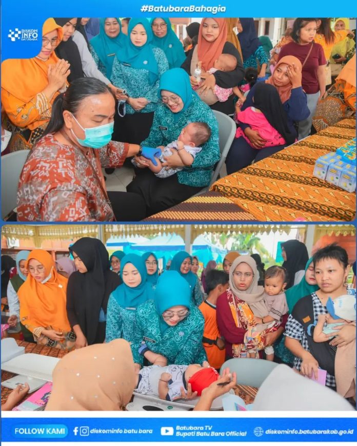 Batubara ll Batara TV Group//-Dalam rangka Pekan Imunisasi Dunia (PID) di Kantor Camat Air Putih, Indrapura, Kecamatan Air Putih, Jumat (10/4/2026).Ny. Leli Syafrizal meninjau langsung pelayanan posyandu kepada balita serta mengikuti pemberian vaksin secara simbolis bersama Kepala Dinas Kesehatan PPKB Kabupaten Batu Bara, Renold Asmara, dan Kepala Puskesmas Indrapura, dr. Juni Hainarida.