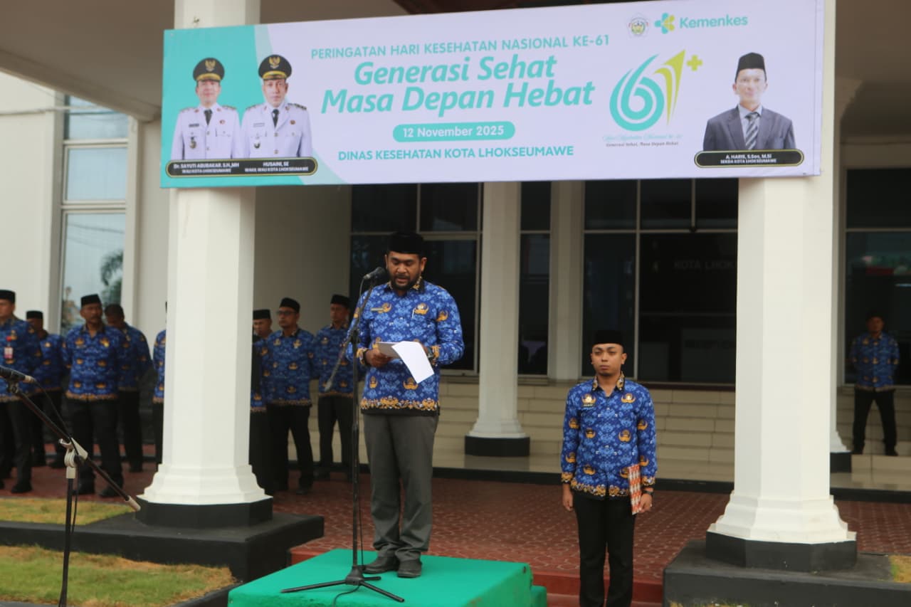 Pemerintah Kota Lhokseumawe menggelar Upacara Peringatin Hari Kesehatan Nasional (HKN) ke-61 di halaman Kantor Wali Kota, Rabu (12/11). Kegiatan berlangsung khidmat dan diikuti jajaran ASN Pemko Lhokseumawe, tenaga kesehatan, serta perwakilan dari berbagai fasilitas pelayanan kesehatan di Kota Lhokseumawe. Asisten Pemerintahan, Keistimewaan Aceh, dan Kesejahteraan Rakyat, Muhammad Maxsalmina, S.Hi., M.H., mewakili Wali Kota bertindak sebagai pembina upacara sekaligus membacakan amanat Menteri Kesehatan Republik Indonisia Budi G. Sadikin.