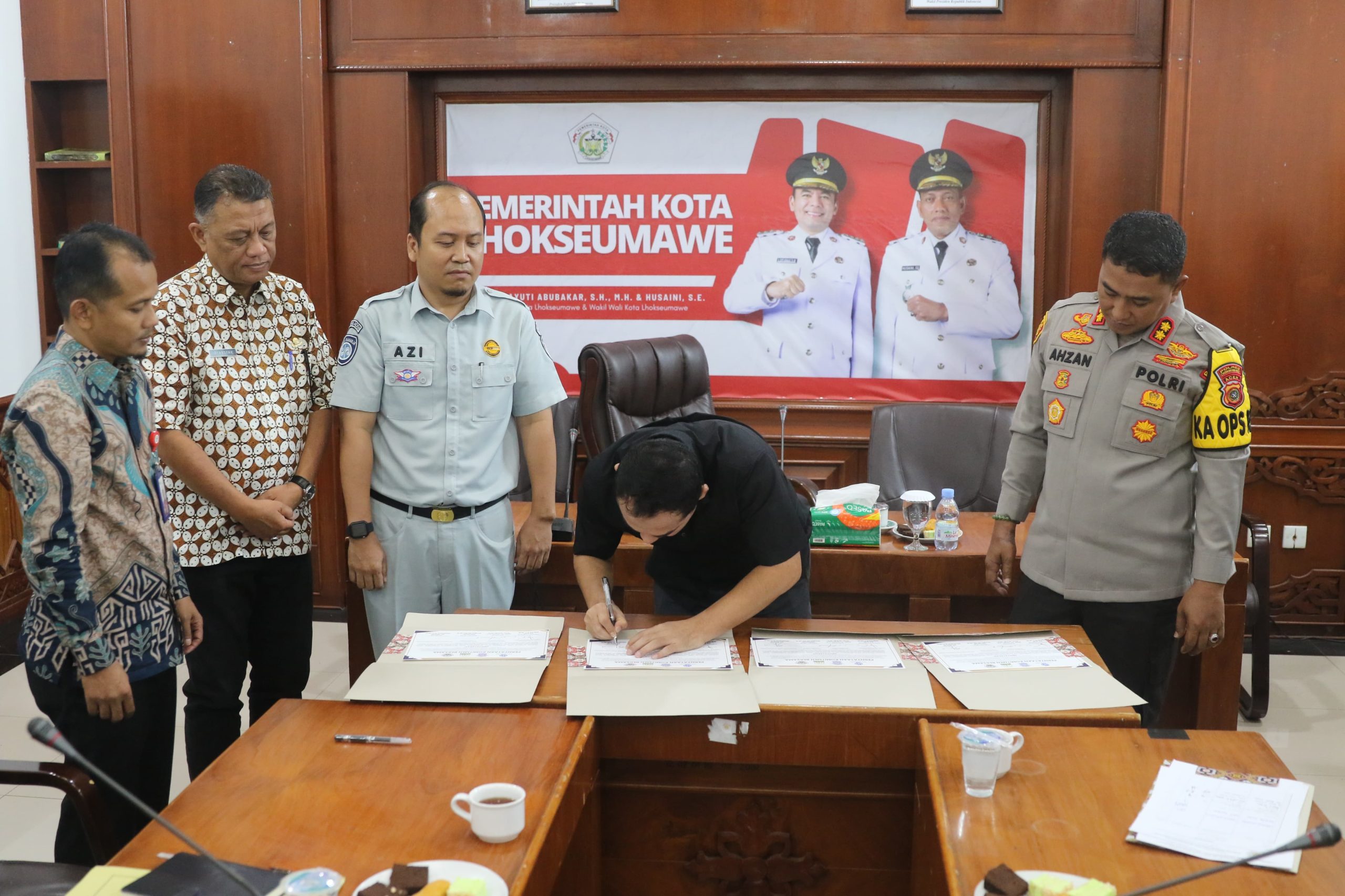 Wali Kota Lhokseumawe Dr. Sayuti Abubakar, S.H., M.H., menandatangan Pernyataan Komitmen Bersama antara Pemerintah Kota Lhokseumawe, PT Jasa Raharja Cabang akota Lhokseumawe, Polres Lhokseumawe, dan UPTD Wilayah V BPKA, Kamis (20/11). Kegiatantersebut yang berlangsung di Aula Kantor Wali Kota setempat, turut dihadiri Kapolres Kota Lhokseumawe AKBP Dr. Ahzan, S.H., S.I.K., M.S.M., M.H.; Kepala UPTD Wilayah V Irfansyah Siregar, S.E., Ak., M.Si.; serta Kepala Cabang Jasa Raharja Lhokseumawe Azi Suzi Wijaya, S.T., M.M.